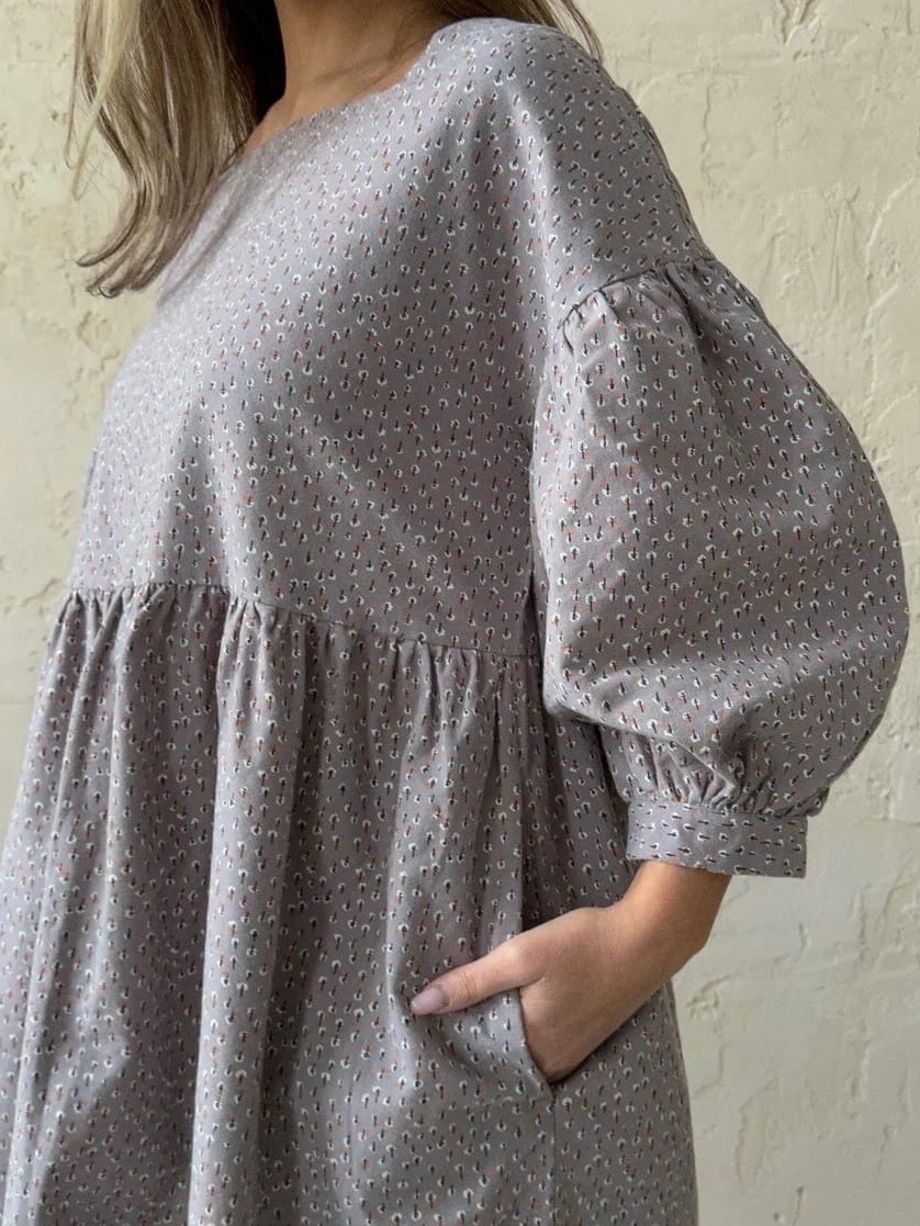 Платье из теплого хлопка "Мелкие белые листочки на серо-бежевом"