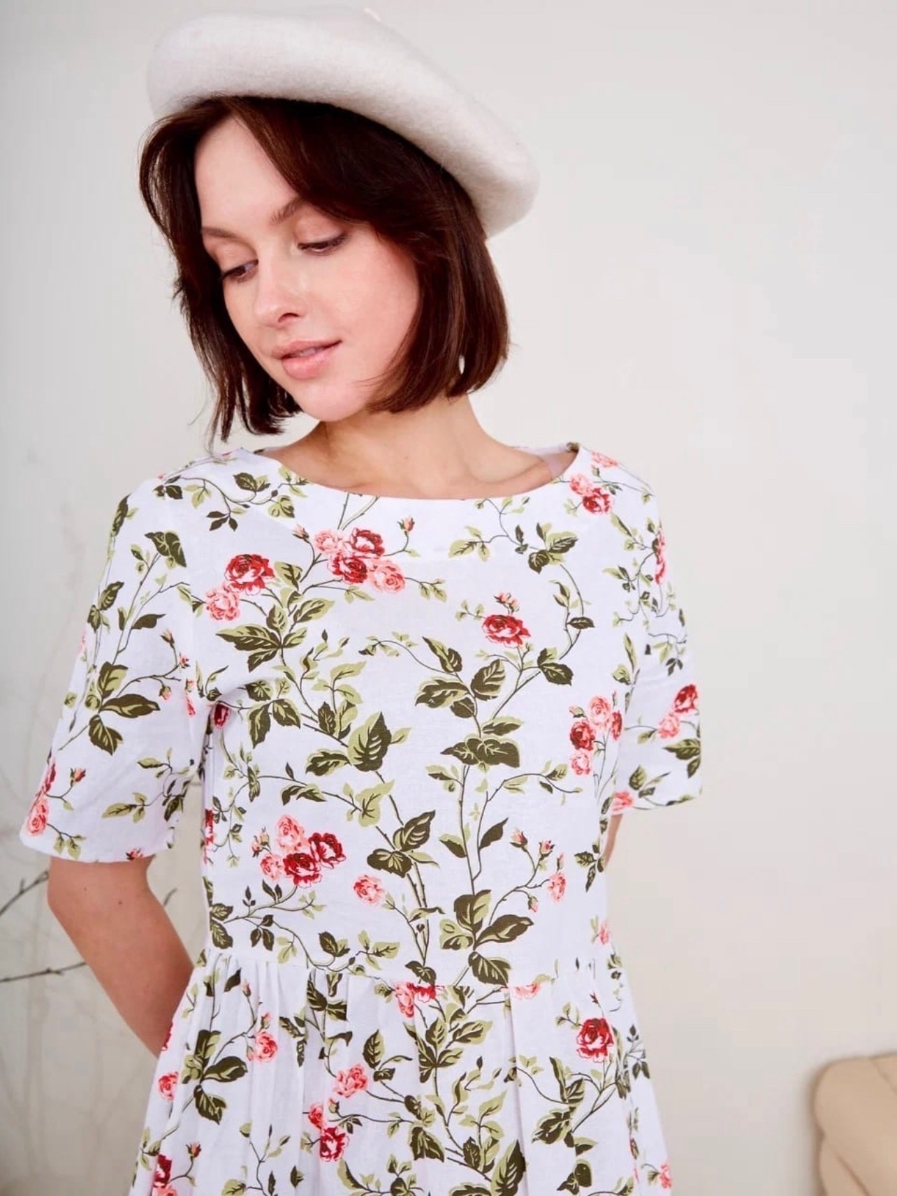 Платье из полульна "Плетистая розочка на белом"