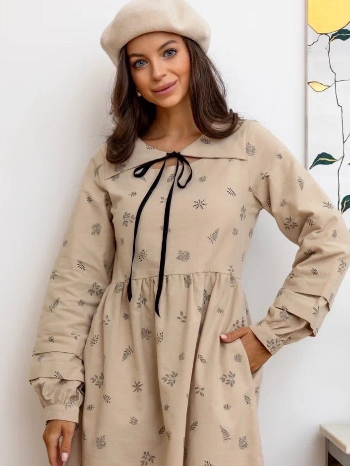 Платье из теплого хлопка "Сухоцветы"в бежевом цвете