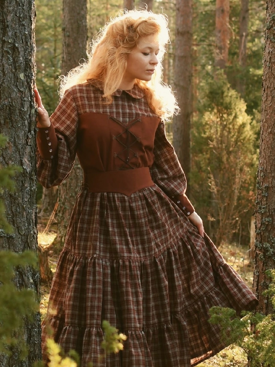 Платье из теплого хлопка "Мелкое соцветие на темно-коричневом с оттенком хаки"