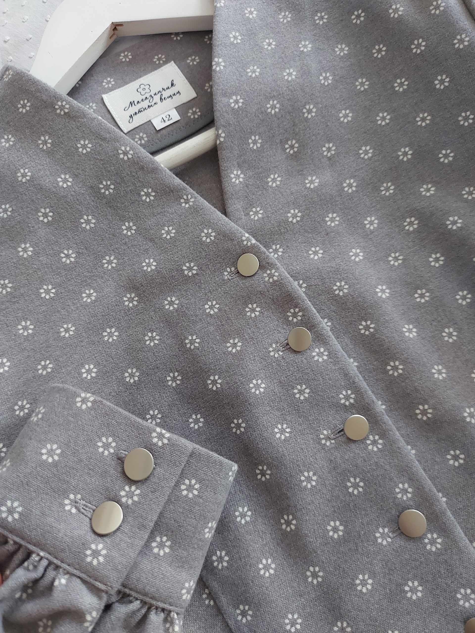 Платье из теплого хлопка "Набойка - белые цветочки" цв.серый меланж