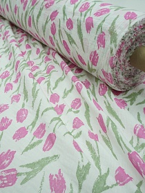 Муслин двухслойный с эф.жатости "Акварельные тюльпаны" цв.белый, ш.1.4м, хлопок-100%, 120гр/м.кв