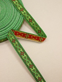 10132 товаровЖак.лента 17мм Лимонно-желтый/красный орнамент на сверкающем зеленом