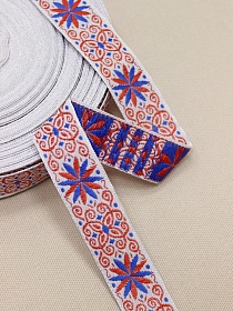 Жак.лента 24мм Оранжево-красный/св.васильковый орнамент на белом