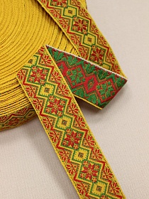 Жак.лента 31мм Красно-зеленые снежинки-ромбики на желтом