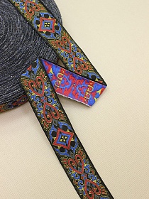 Жак.лента 32мм Сине-красный орнамент на черном