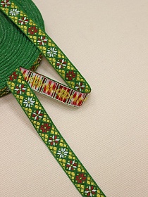 Жак.лента 18мм Желтый/красно-белый орнамент-снежинка на зеленом