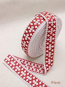 Лента тканая для поясов, 40мм Красный орнамент на белом, рис.9532
