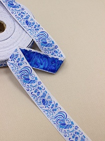 Жак.лента 32мм Васильково-бирюзовые петухи на белом