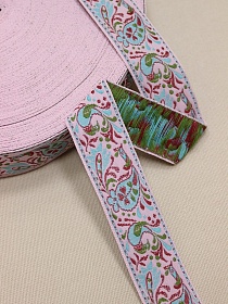 Жак.лента 33мм Мятно-зеленые птички на бледно-розовом
