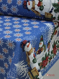 Мерный лоскут (ткань в отрезах) Рогожка "Снеговики со снежинками" цв.винтажно-синий, ш.1.5м, хлопок-100%, 160гр/м.кв