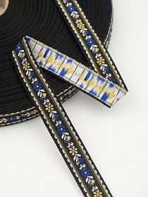 Жак.лента 18мм Желтые/синие цветы (белые листочки) на черном, рис.8749/7