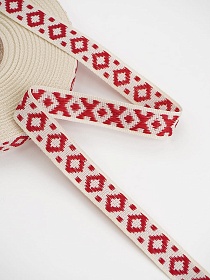 Жак.лента 17мм Славянский оберег Красные ромбики на кремовом