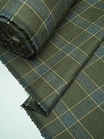 Шерсть пальтово-костюмная Твид "Клетка бежево-джинсовая на зеленом хаки", ш.1.5м, шерсть-50%, пэ-50%