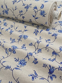 Полулен "Синий цветочный вьюнок" (на т.суровом), ш.1.5м, лен-30%, хлопок-70%, 140гр/м.кв