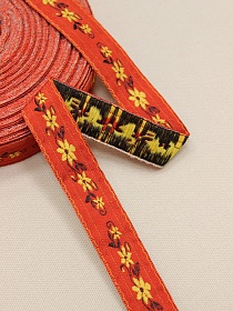 10762 товаровЖак.лента 24мм Желтые цветы на оранжево-красном