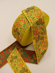 Жак.лента 67мм Красная рябина/зеленые листочки на желтом