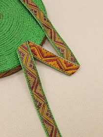 Жак.лента 16мм Горчичный/винтажно-бордовый орнамент на сверкающем зеленом