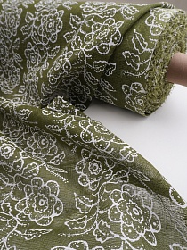Льняная сетка "Цветочное переплетение под набойку" цв.зеленый хаки/белый, ш.1.1м, лен-100%, 100гр/м.кв
