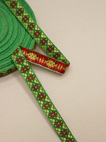 11030 товаровЖак.лента 17мм Лимонный/красный орнамент-снежинка на сверкающем зеленом