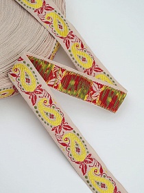 Жак.лента 18мм Темно-красный/сигнальный желтый орнамент на сверкающем зеленом