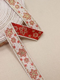 10844 товаровЖак.лента 23мм Золотистые с красным снежинки на молочном