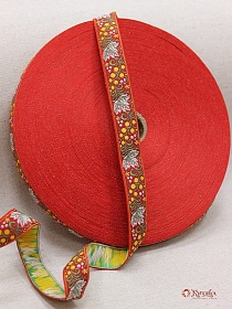 Жак.лента 23мм Желтые ягоды, белые листочки на красном