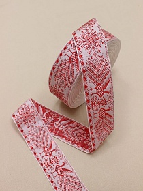Жак.лента 23мм Красный/ярко-лимонный/белый орнамент на сверкающем зеленом
