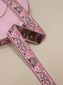 Жак.лента 33мм Завитушки (цв.серо-бежевый/розовая брусника) на нежно-розовом