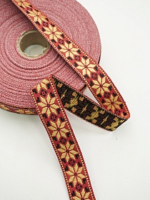 Жак.лента 24мм Светло-желтая (с черным) снежинка-цветок на темно-красном, рис.9455