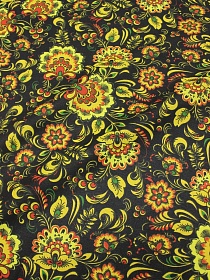 Рогожка "Желто-зеленая хохлома на черном с птицами", ш.1.5м, хлопок-100%, 170гр/м.кв