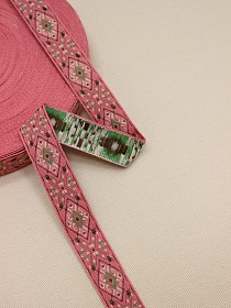 Жак.лента 22мм Св.зеленый/коричневый/молочный орнамент на розово-брусничном