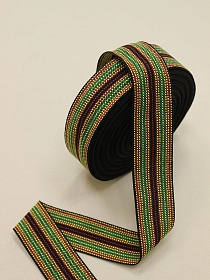 Лента тканая для поясов, 40мм Красно-желтая с зеленым строчка на черном