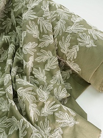 Полулен с вышитым рисунком "Дубовые листочки" цв.хаки, ш.1.35м(выш.часть1.2м), хл-50%, лен-50%