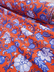 Саржа "Синий цветочный узор на оранжево-красном", ш.1.5 м, хлопок-100%, 200гр/м.кв