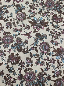 7820 товаровПолулен "Коричнево-сиреневые сказочные цветы с птичками" (на суровом), ш.1.5м, лен-30%, хл-70%