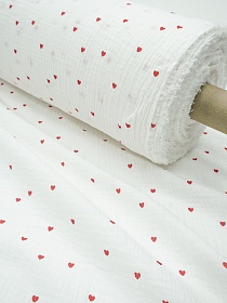 Муслин двухслойный с эф.жатости "Красные сердечки" цв.белый, ш.1.4м, хлопок-100%